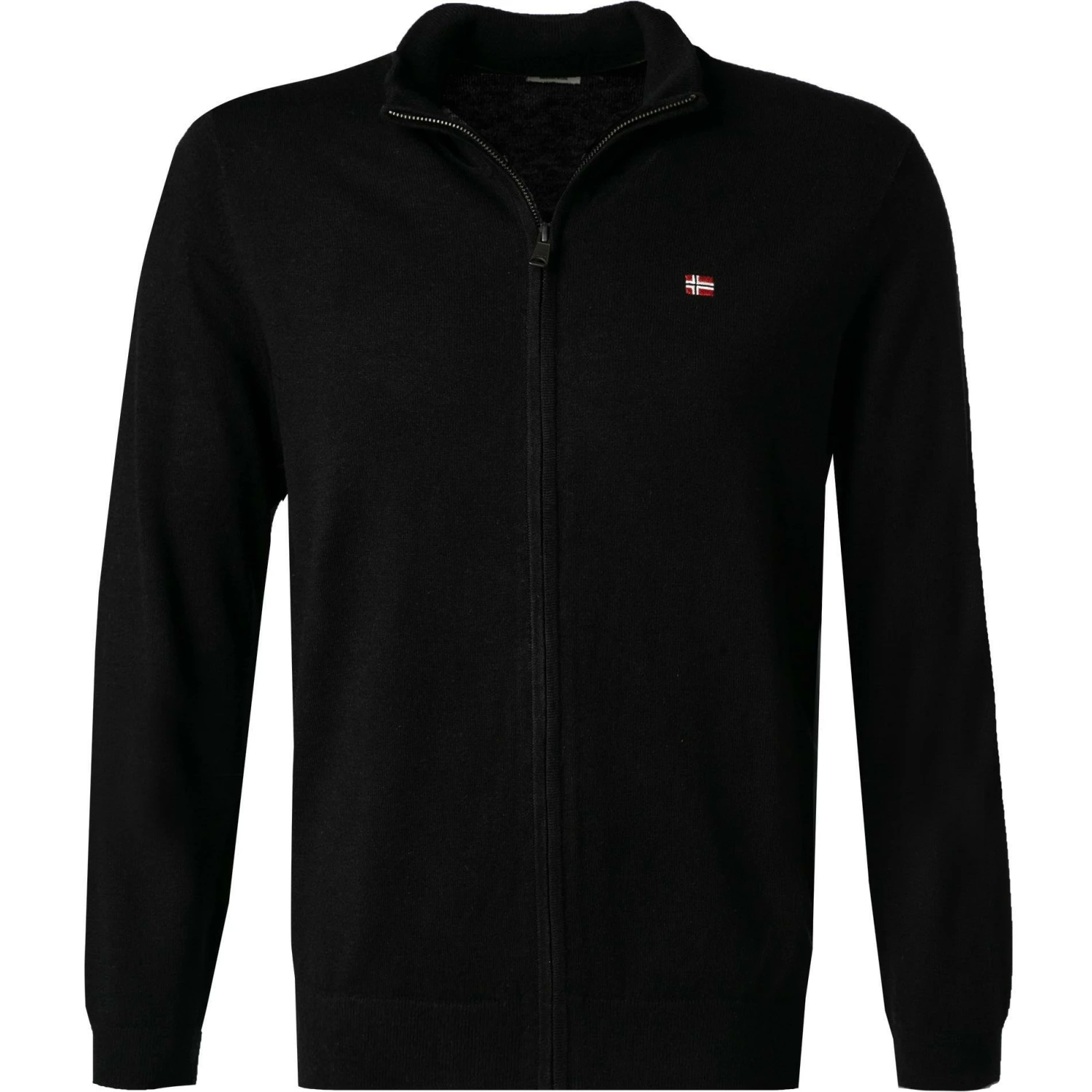 Vorderteil: Stehkragen mit Reißverschluss, Armausschnitt gemindert, Rippenstrickbündchen am Ärmelabschluss mit Kontraststreifen, Rippenstrickbündchen am Saum